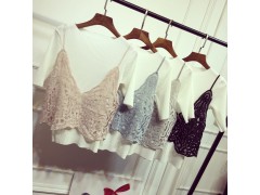 2016夏季韩版新品百褶白色短袖上衣+蕾丝镂空吊带两件套T恤女装潮