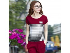 圆领短袖七分裤运动套装女2016夏季条纹纯棉二件套女士散步批发