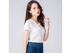 女都2016新款韩版V领绑带细横条纹T恤女时尚修身显瘦