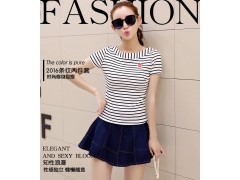 2016夏季新款韩版女装修身圆领时尚潮流短袖t恤衫牛仔短裙两件套